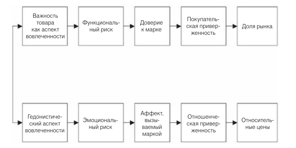 В первой цепочке «важность товара» отражает функциональные, рациональные свойства товара и связывается с «доверием к марке». Вторая цепочка показывает, что гедонистические, эмоциональные аспекты формируют аффект и отношения с маркой. Принимая решение о покупке, покупатель принимает на себя совокупность рисков. «Риск решения» (риск выбора) — это величина конфликта, который может быть вызван приобретением и пользованием данным товаром. При этом пять типов риска, описанных в научных работах, разбиваются на две группы: функциональный (финансовый, физический и риск выполнения/невыполнения обязательств) и эмоциональный риск (социальный и психологический).