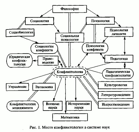 Конфликтология уходит корнями в философию и активно взаимодействует с другими дисциплинами (рис. 1). На сегодняшний момент самая большая доля исследований в русле конфликтологии принадлежит социологии и психологии. Хотя эти две науки и являются взаимопроникающими, между социологическим и психологическим подходами к конфликту существуют различия. Если социология ориентирована в первую очередь на рассмотрение конфликтов в обществе, в системе общественных отношений, то психология изучает внутриличностные и межличностные противоречия, а также занимается поиском средств, способствующих разрешению конфликтов. В данном учебнике используется социально-психологический подход.