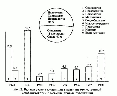 Развитие этих дисциплин в отечественной науке, как видно из графика на рис. 2, шло неравномерно. Наибольшее количество публикаций и сегодня принадлежит психологии (26,5 %) и социологии (16,9%), что вполне понятно. Это ведущие дисциплины, откуда черпает конфликтология не только знания, но и идеи, на которые опирается в своем развитии, на чьи запросы и потребности реагирует молодая еще наука.