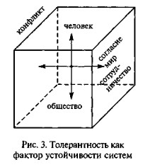 Толерантность, как показано на рис. 3, есть средняя позиция, позволяющая сохранять равновесие, устойчивость, как внутриличностную, так и социальную. Если эта средняя линия, или ось толерантности, сдвигается в одну или в другую сторону, равновесие, симметричность фигуры нарушается. Как мы видим, человек и общество находятся между полюсами конфликта и мира, гармонии. В своем историческом развитии человечество постоянно пытается выбирать лучшее, действовать эффективнее, более рационально, но неизменно сдвигает фокус своего внимания то влево, то вправо. «Мы верим, что и человечество, и научное мышление неизбежно придут к открытию, что не только конфликт является универсальным двигателем эволюции, не только борьба за существование выступает как монопольная сила отмирания старых и появления новых видов на нашей планете», — пишет А. Г. Асмолов [8, с. 3]. Взаимная помощь в мире людей и животных также является фактором эволюции.