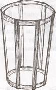 Бюгели и рамки. Бюгелями или рамками называют шаблоны в форме обручей разнообразной величины сплетенные из прутьев (рис. 14-2). По изготовлении дна и укреплении к нему боковых ребер бюгель надевают сверху на ребра и, прикрепив их к нему на время плетения корпуса на надлежащей высоте, заставляют их принять очертания, соответствующие форме бюгеля.