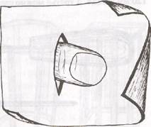 Напалок. Чтобы не травмировать палец, прижимающий шину перед самым ножом, сделайте напалок. Его не надо сшивать. Найдите кусочек мягкой кожи (срежьте со старого ботинка, приготовленного к выбросу) размером, примерно, 9x13 см, сделайте в нем отверстие в форме продолговатого овала, отступя от кромки сантиметра два (см. рисунок 15) , и напалок готов. Пропустите в отверстие палец. Он ложится поверх кожи. Теперь не травмируете палец.