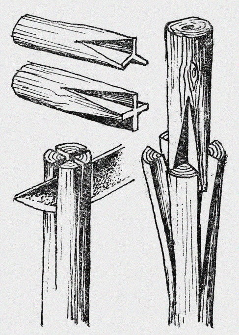 Колунки можно сделать из металла, кости и дерева твердой породы (бук, яблоня, груша, ирга). В самый центр деревянного колунка забивают драночный гвоздик с таким расчетом, чтоб после того, как откусите шляпку, осталось еще 5 мм. Конец откушенного гвоздика гладко закруглите, чтоб он, внедряясь в рыхлую древесину, не порол ее, а плавно двигался по сердцевине, ведя за собой колунок точно по центру. Металлический двухгранный колунок, предназначенный для раскалывания прутьев на две части, можно тоже сделать с направляющим стержнем, а многогранный труднее. На двухгранном колунке стержень вытачивается вместе с гранями.