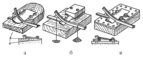Если изготовление плоскостных стругов вызывает затруднение, то можно в деревянном брусочке прорезать канавку, над которой закрепить под углом нож. Протягивая шину через канавку, получают ленту, по толщине равную глубине канавки. Некоторые опытные мастера отстрагивают шины и без струга, просто пропуская шину между ножом и указательным пальцем правой руки (для предохранения на палец обязательно надевается кожаный напальчник).