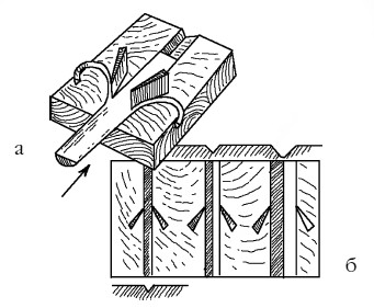 Перечислим основные причины некачественного строгания краевых стругов: если ножи не режут, а скоблят – значит велик угол между ножами; когда лента проскальзывает и края не срезаются – значит угол между ножами мал либо ножи ошибочно установлены плоскими сторонами наружу; еще возникает дефект при одностороннем срезании края ленты – значит, канавка прорезана не по центральной линии между ножами.