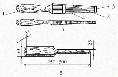 Рис. 13. Изер: а – металлический; б – деревянный. 1 – рукоятка; 2 – плоская сторона пластины; 3 – фаска; 4 – полукруглая сторона