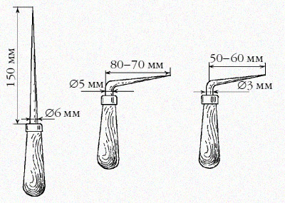 Шилья. Они потребуются при заплетении верхних кромок безлучковых корзин, при возведении основы этих корзин, при устройстве ручек. Их надо иметь, по крайней мере, три. Одно — толще карандаша, другое — раза в два тоньше, а третье — среднее между ними. Сделать их очень просто. Найдите подходящий сучок яблони, отрежьте от него конец сантиметров десять, грубо обработайте и забейте в торец большой 150 мм гвоздь на глубину 30-40 мм. Затем откусите шляпку и заточите конец. Особой остроты не требуется. Обработайте поаккуратней ручку. Другое шило сделайте из 120 мм гвоздя, а третье можно сделать из прутка.