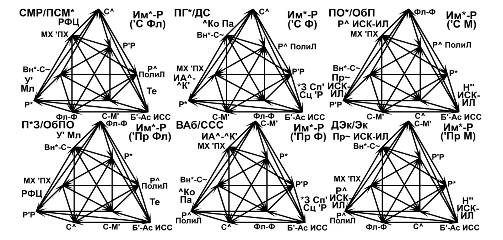 За каждой разверткой G из 27 законов закрепляется группа из шести ее базовых мутаций [10], среди которых две ориентированы на философские, две – на физические и две – на математические начала. Осмысленные комбинации на 27 законах, образующие триады в указанных базовых мутациях, понимаются как объективные законы той конкретной реальности, что скрывается за разверткой G. А комбинации в указанных базовых мутациях, образующие уже ДИС-*К уровня 2, понимаются как представители этой реальности. Наконец, в мутациях, ориентированных на философские начала, объективные законы выступают в статусе механизмов, в ориентированных на физические начала – качеств, в ориентированных на математические начала – ролей. Разумеется, в каждой из сформированных разверток можно осуществить дешифровки законов до мини-категорий в НЛ-Б' и произвести структурный анализ с осмыслением на более тонком уровне, используя базовые мутации в рамках всего Γ0. Тогда новые осмысленные комбинации мини-категорий, образующие триады в указанных базовых мутациях, понимаются как производные законы той конкретной реальности, что скрывается за разверткой G.