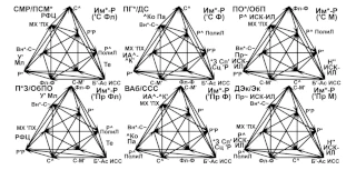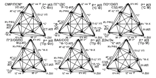 Каждая из приведенных схем по-своему оригинальна. К настоящему времени все они объединены до выстраивания соответствующей смысловой единицы развития, основу которой составляет ориентированный интеллект. В совокупности это дает 360 качественно различных режимов процесса рассуждения по развертыванию интеллекта. Если в схемах на рис. 2 отражены лишь 9 различных представителей по тематике интеллекта, то в самой смысловой единице развития таких оказывается 30 штук. Перечислим их имена в алфавитном порядке: актовая самоорганизация, апробирующий интеллект, архитектура интеллекта, герменевтика интеллекта, интерпретирующий интеллект, знаки функционирования субстрата, инновационное любопытство, исследовательское любопытство, конструктивная оригинальность, культурный интеллект, локально ориентированный интеллект, методологическая состоятельность, научный интеллект, образная состоятельность, операциональное любопытство, ориентированный на развитие интеллект, осмысление деятельности, режимная самоорганизация, семиотическая самоорганизация, смысловая оригинальность, смысловая состоятельность, созидательный интеллект, структурный интеллект, субстанциальность интеллекта, субъектный аспект интеллекта, управленческий интеллект, фазовая оригинальность, фазовоориентированный интеллект, функциональность интеллекта, функциональный интеллект.