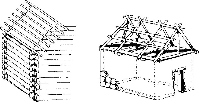 Тип крыши более старый, чем двускатная, — крыша на стропилах изображена на рис. 170 (южнорусская) и 171 (севернорусская). В последнем случае имеется также фронтон, но каркас крыши опирается не на него, а па 3—4 пары стропил. Стропила опираются нижним концом о верхнее бревно длинной стены, а их верхний конец прикреплен к коньковому брусу (князевая слега), где скрещиваются две пары стропил. На стропила положены 2 — 3 пары слег — горизонтальных длинных жердей, имеющих различные названия: обрешетина, решетина, пожилина, складник, лотока; лата, лавина (укр., от немецкого Latte — «слега»); лата, прут (белорус.).