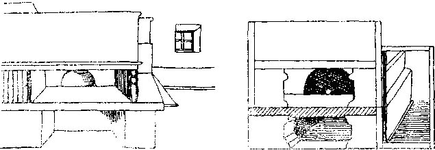 Описание разных видов печей было бы неполным без упоминания простейшей полевой печи, которую вкапывают в землю и на которой варят пищу. Украинцы называют ее паланка, но чаще — тюркским словом кабиця (см. рис. 174). В естественной или специально сделанной земляной террасе выкапывают горизонтальную канаву, в нее кладут дрова. Над дровами делают отверстие, над которым ставят котел.