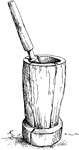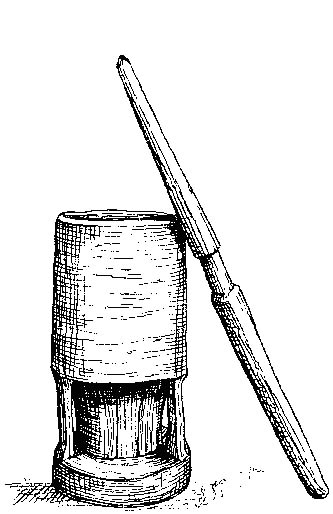 § 37. При толчении в ступе зерно очищается от оболочек, однако размельчается оно при этом незначительно. В результате получается крупа, а не мука, притом крупа довольно грубая (так называемая кутья, заспа). Славянские названия толченого проса (пьшено), кукурузы (рус. пшонка), пшеницы (пьшеница) происходят от глагола пьхати, т. е. «толочь (в ступе)». Как мы видим, это еще не мука. Последняя появилась лишь тогда, когда славянин стал не размельчать зерно в ступе ударами песта, а растирать его одним плоским камнем на другом, также плоским или с небольшим углублением. Соединение двух камней для размельчения зерна дало ручную мельницу, сохранившуюся до наших дней.