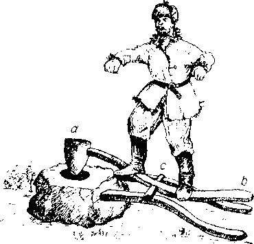Самый простой способ показан на рис. 51: берутся два гладко обтесанных четырехугольных сухих ясеневых бруска в 1 м длины и 10—12 см толщины. В один из них вбиты на концах два маленьких топких колышка, которые служат рукоятками; в середине другого имеется небольшой желобок, в который положен кусочек берестяного трута. Брусок с трутом кладут на землю или привязывают трутом вверх к какой-либо неподвижной