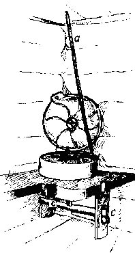 (рис. 55). Здесь деревянный цилиндр а неподвижно прикреплен к скамье. (На рисунке он немного приподнят, чтобы было видно, каким образом он укреплен.) Сверху у этого цилиндра тонкий стержень, на котором вращается деревянный круг с.