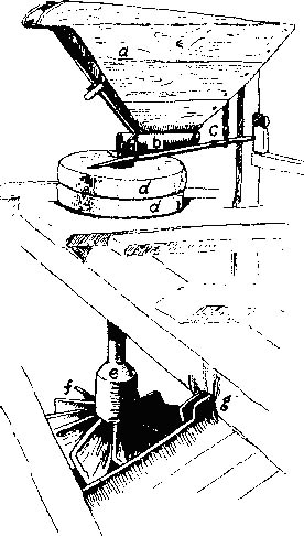 Поднимаясь или опускаясь, веретено b регулирует помол: когда оно поднято, поднимается и верхний жернов, который при этом оказывается на большем расстоянии от нижнего, и благодаря этому помол получается более крупный.