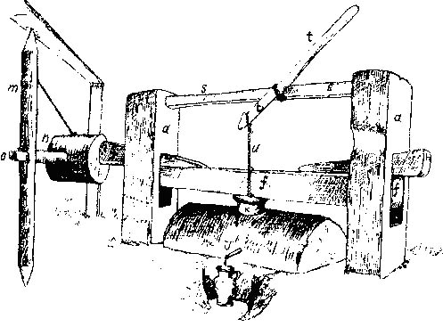 Когда все масло выжато, клинья gh выбивают молотком и перекладину f поднимают с помощью привязанного к ней рычага t (підойма). Затем убирают цилиндр к и вынимают из углубления в колоде остатки семян. Во всем этом устройстве нет ни одной металлической части, даже гвоздя.
