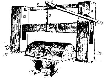§ 39. Маслобойка. Для получения масла из конопляного и льняного семени русские пользуются тем же самым устройством, которое все восточные славяне используют как воскобойку. Это приспособление (см. рис. 38) — вертикальный пресс, в котором массу сжимают, забивая в пресс сверху клинья. Севернорусские пользуются им для приготовления как воска, так и масла, и называют его бойник, жом. Для прессовки массу закладывают между двумя вертикальными досками аа (так называемые ладоши). Эти доски сближают с помощью клиньев сс, которые забивают сверху обухом топора. Именно благодаря этому забиванию клиньев в пресс и возникло выражение «бить масло».