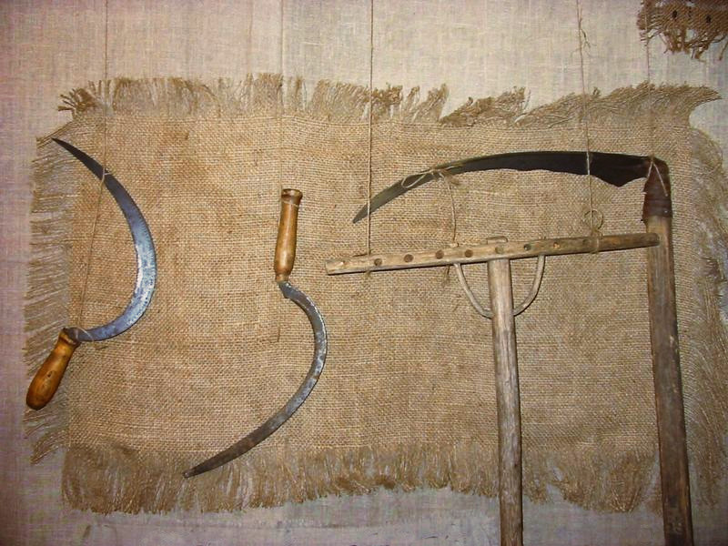 На рис. 13 (по А. Сержпутовскому) изображены белорусские орудия: коса без грабель (а), коса с грабельцами (b), небольшая наковальня (бабка, клепало, ковадло, севрус. коваленка — с), на которой лезвие косы куют или отбивают молотком (d), песочница (е), т. е. конусообразный сосуд с водой или песком, который косарь носит на поясе и в который кладут точильный брусок (f), чтобы точить косу, и, наконец, деревянная лопатка (белорус. трапышка, ментушка, сцепалка) с нарезкой (g), которую окунают в воду, посыпают песком и используют для заточки косы (лопатят, белорус. трапышат).