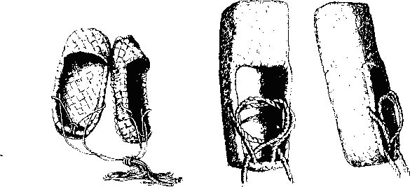 При плетении пользуются четырехугольной продолговатой колодкой, в которую забивают небольшие гвозди. Неношенные чуни сохраняют прямоугольную форму этой колодки (см. рис. 155)..