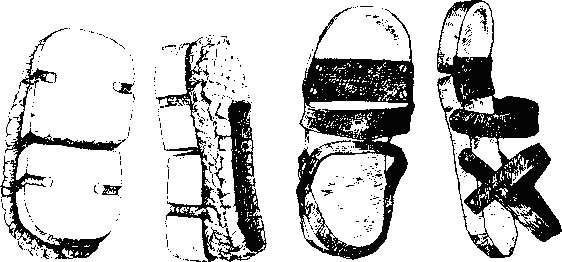 Для прочности к лаптям приделывают подметки, которые оплетают пеньковыми веревками, а иногда тонкими полосками древесины дуба, размоченными в горячей воде. Когда на улице сыро и грязно, к подошвам лаптей привязывают деревянные колодки, каждая из которых состоит из двух дощечек (см. рис. 157)..